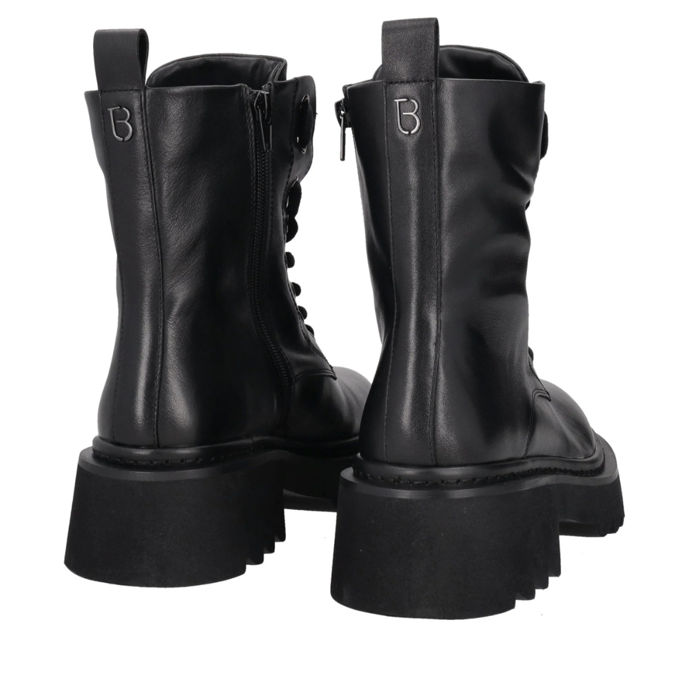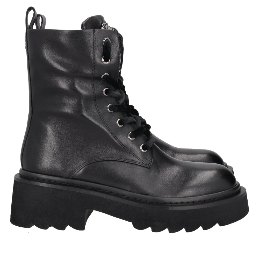 Anfibi in pelle nera con maxi pietra decorativa e suola carrarmato da 5,5 cm. Un mix perfetto di stile, comfort e carattere per un look grintoso e alla moda.