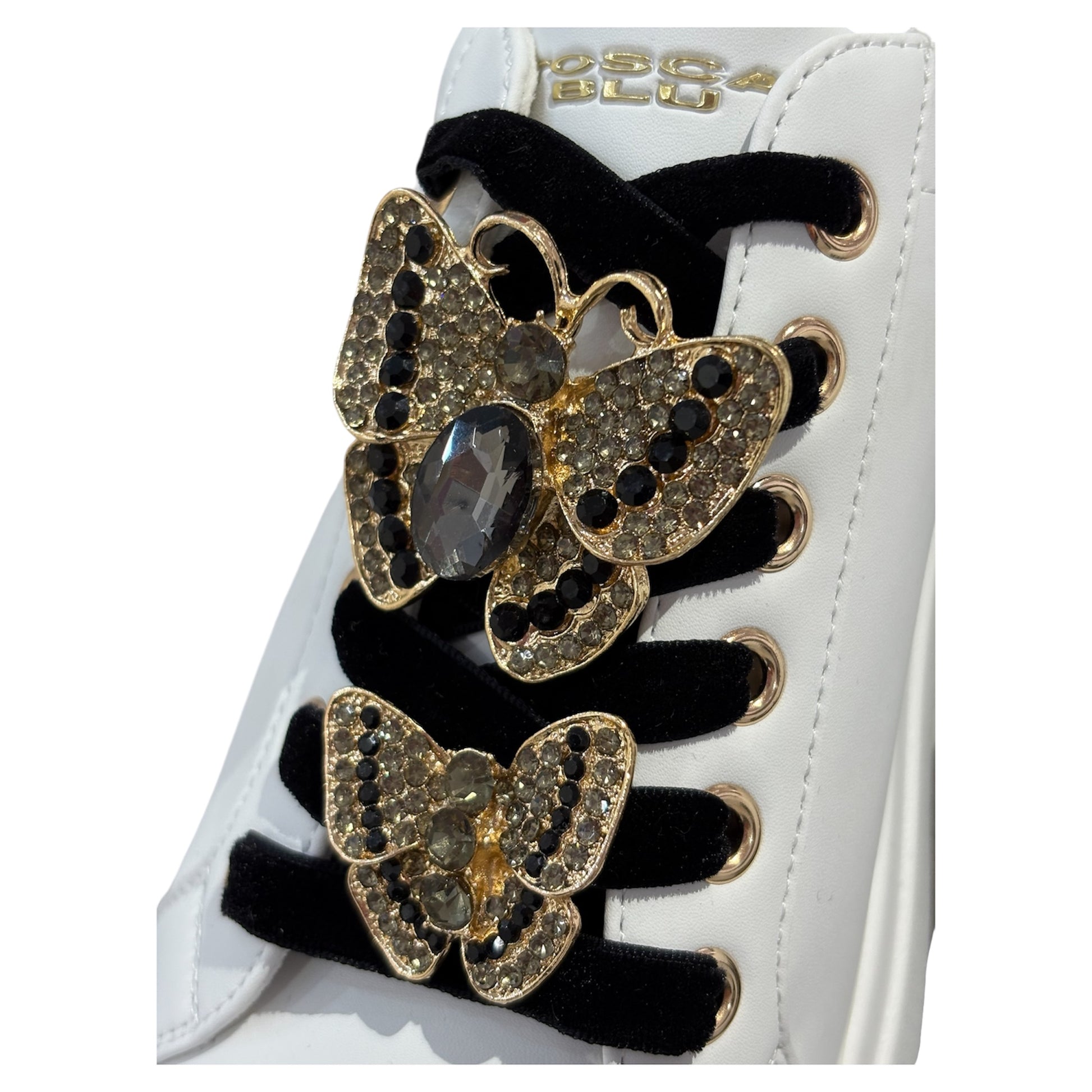Sneakers Tosca Blu bianco/nero con dettagli di farfalle oro e zeppa da 6 cm. Eleganti e grintose, aggiungono un tocco glamour ad ogni look.