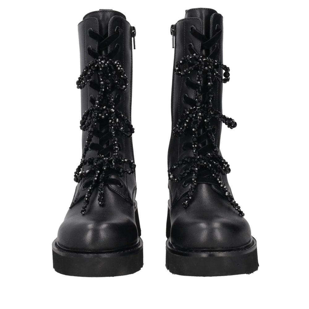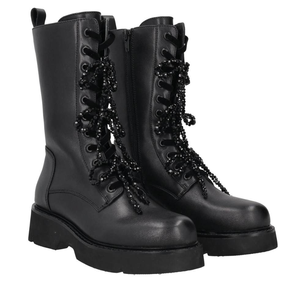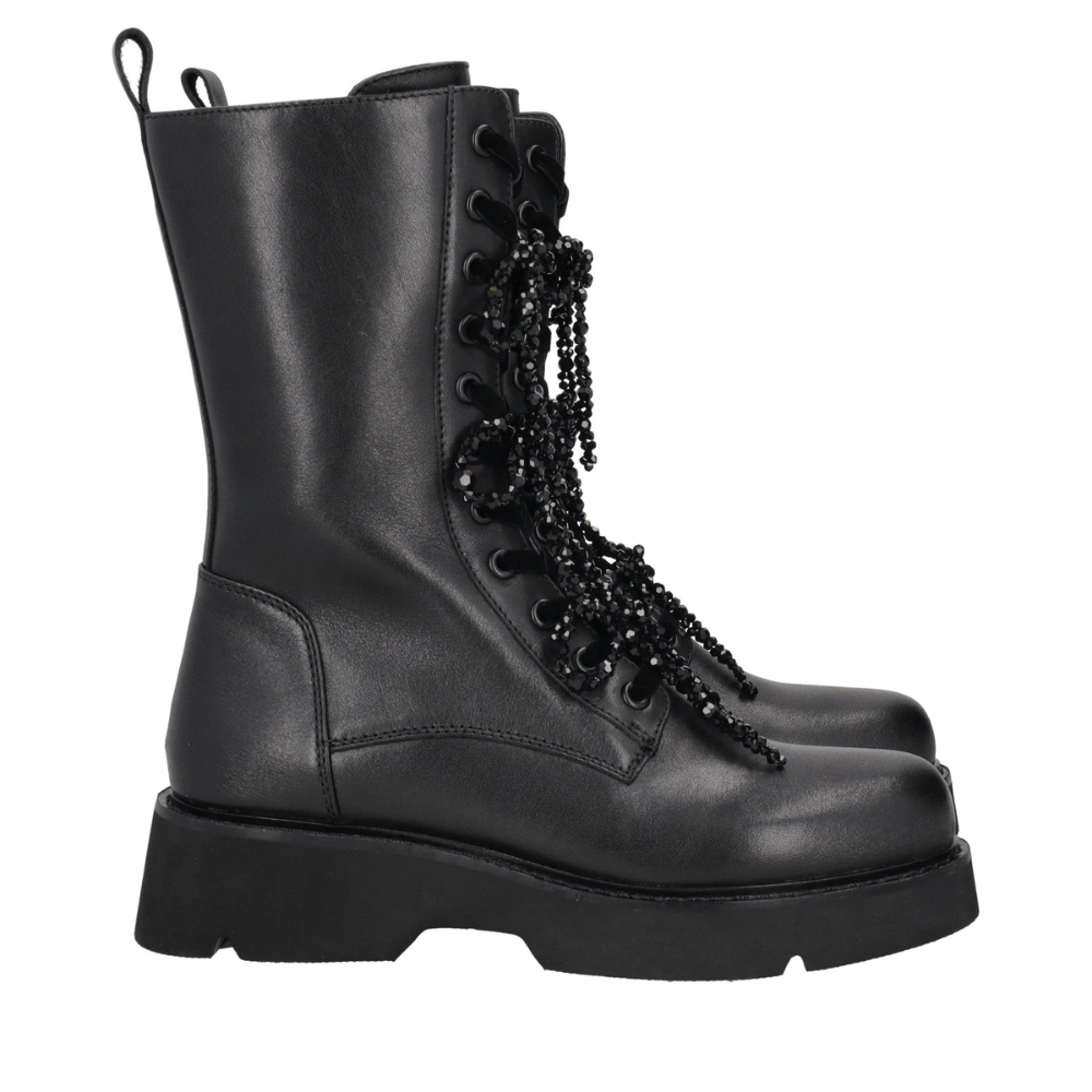 Anfibio in pelle color testa di moro con fiocchi decorati da perle e micro cristalli. Zip laterale, suola con tacco basso da 5 cm e design raffinato che unisce comfort e stile.