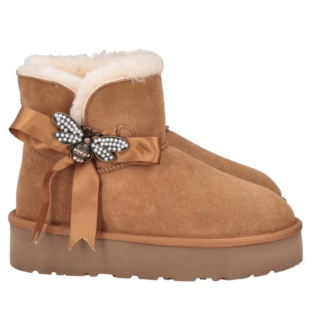 Stivaletti in pelle scamosciata color cuoio con fiocco in raso e ape con strass. Interno imbottito e suola platform da 4,5 cm per comfort e stile impeccabili nelle giornate fredde.