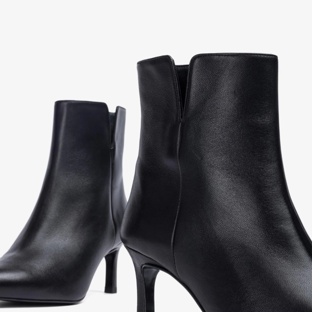 Elegante stivaletto in pelle con punta affusolata, cerniera interna e tacco sottile da 7 cm rivestito in tinta. Suola leggera, flessibile e antiscivolo per uno stile raffinato e confortevole.